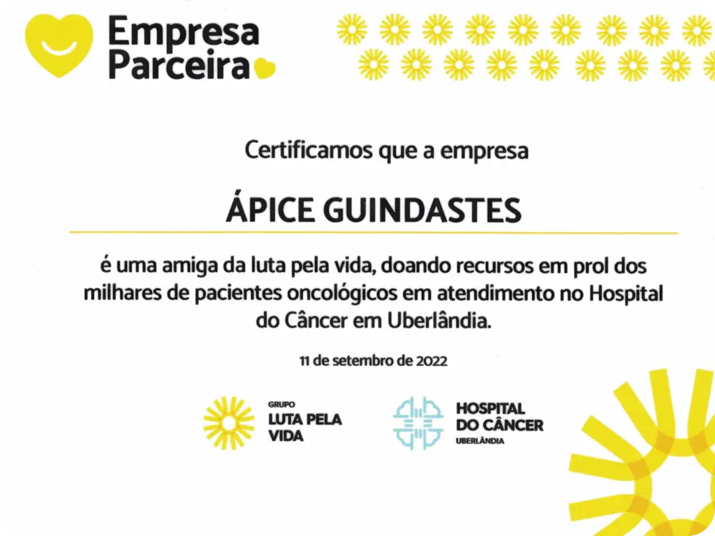Desde sua fundação, a Ápice Guindastes contribui com a doação de valor fixo mensal ao Grupo Luta pela Vida (GLPV), do Hospital do Câncer de Uberlândia. Esta instituição filantrópica oferece assistência aos pacientes com câncer de Uberlândia e região, de modo que as urgências e necessidades do tratamento oncológico sejam atendidas de forma 100% gratuita e humanizada.
